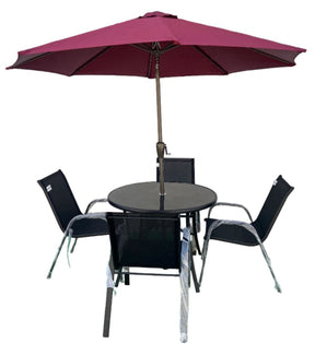 The product is of high quality and brand new has an umbrella with a window has a table with a hole In the middle for installing umbrella has folding chairs with security lock brand.