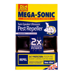 The Mega-Sonic® Twin-Speaker Ultrasonic Pest Repeller from The Big Cheese® provides guaranteed control of rodent pests in living spaces and outbuildings, or your money back.